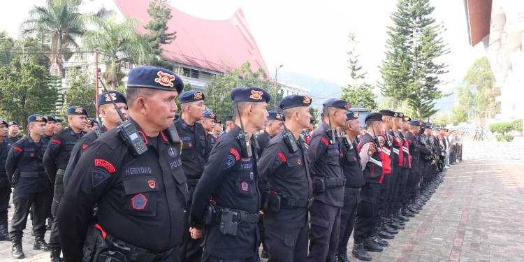 Tebing Tinggi, Sat Brimob Polda Sumut || Kasubsatgas PHH (Danyon B Pelopor Satbrimob Polda Sumut) Kompol Heriyono bersama jajaran Personil Sat Brimob Polda Sumut melaksanakan Apel Pagi yang tergabung dalam Pengamanan F1 Powerboat Tahun 2024 yang berlangsung di Halaman Kantor Bupati Kabupaten Toba Provinsi Sumatera Utara, Rabu (28/02/2024).